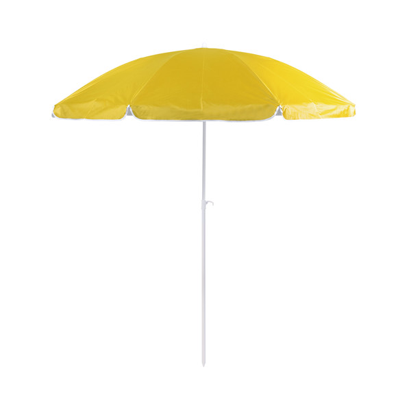 Beach umbrella of 8 panels in resistant nylon, with silver color, UV protection layer. Telescopic pole, adjustable in height and inclination. 200cm in diameter, side flaps with piping and metal coated tubes in white color. In a wide range of bright colors, comes inside a nylon sleeve with shoulder strap. Reclinable. UV Protection. Nylon Pouch