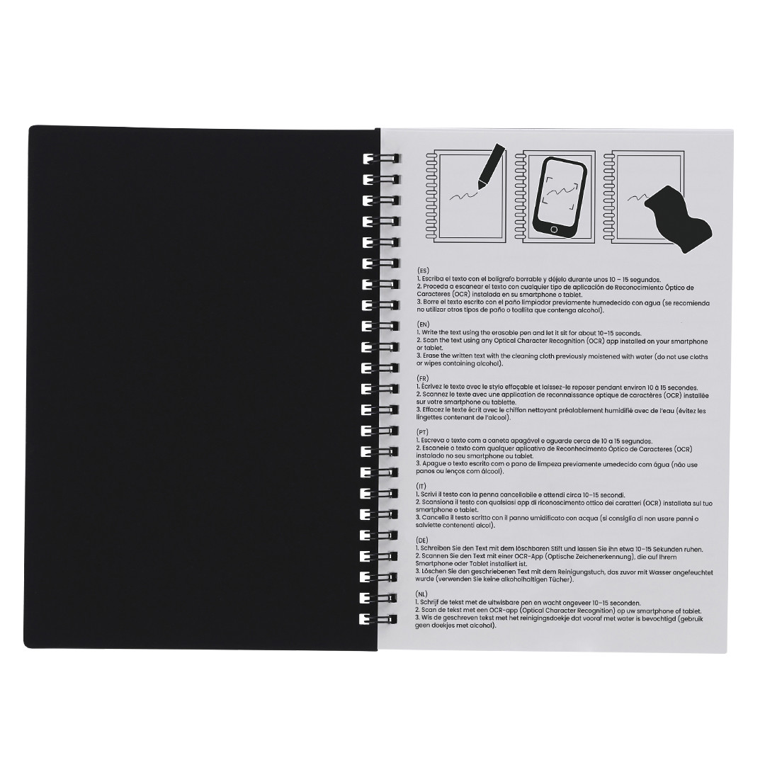 Notebook and erasable pen with included cleaning cloth to enjoy smooth writing and leave room for error. 18-page PP notebook with metal rings. Jumbo cartridge pen in black ink. It allows you to write, erase and rewrite without damaging documents. Made of resistant ABS with a transparent finish. 18 Sheets. Erasable Pen Black Ink and Cleaner Cloth Included