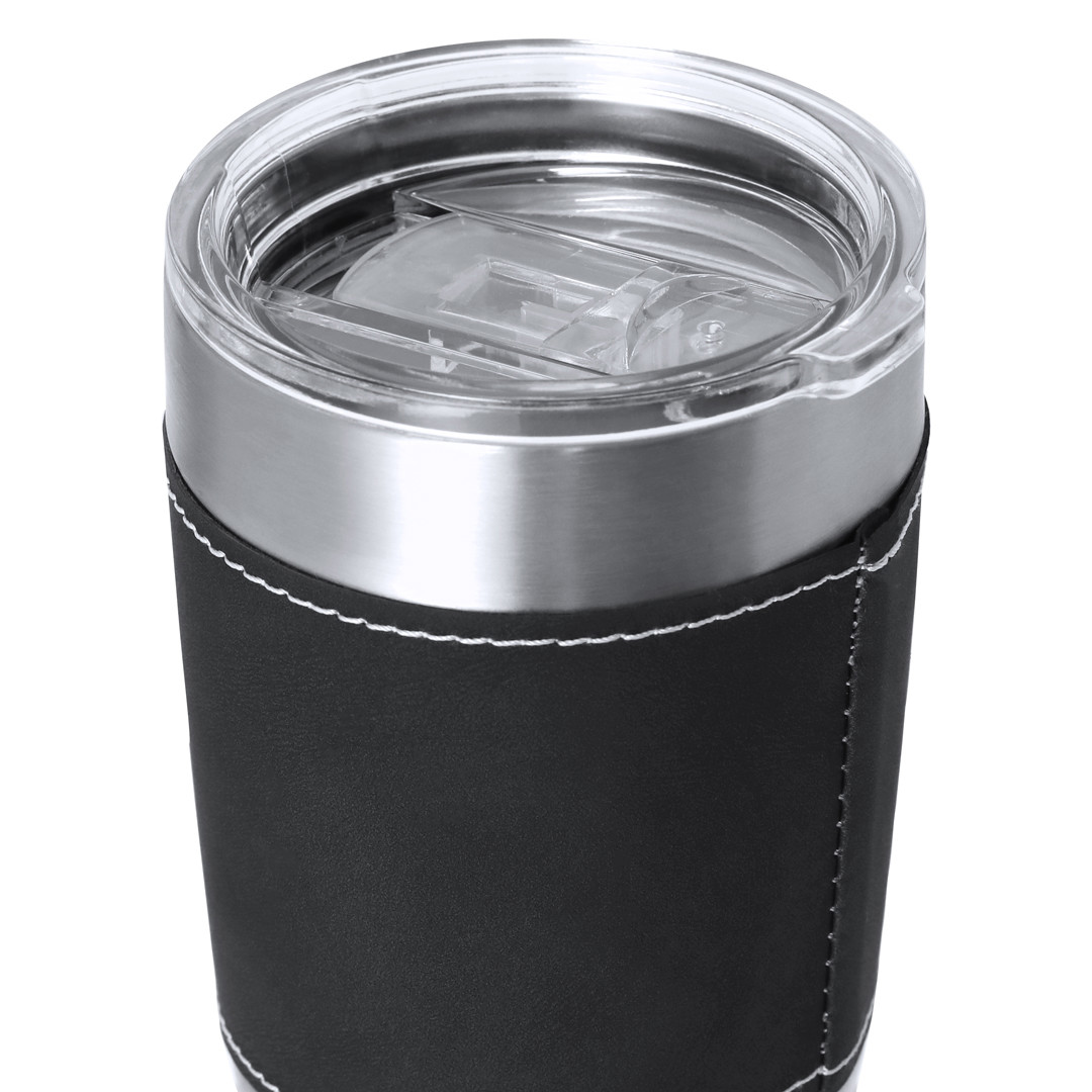 Insulated Mug made of double-walled stainless steel and sophisticated PU. With a capacity of 420 ml. It includes an elegant PU sleeve, manufactured with a distinguished white stitching. It is ideal for your desk, table, or any surface where you can enjoy your favorite drink. Including a transparent lid with dispenser, easy-open, and BPA-free. 420 ml