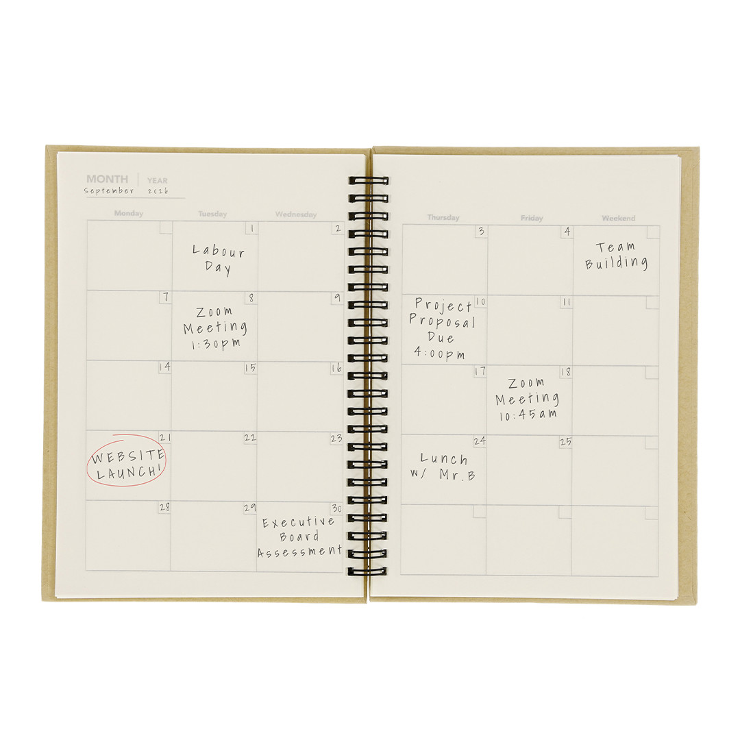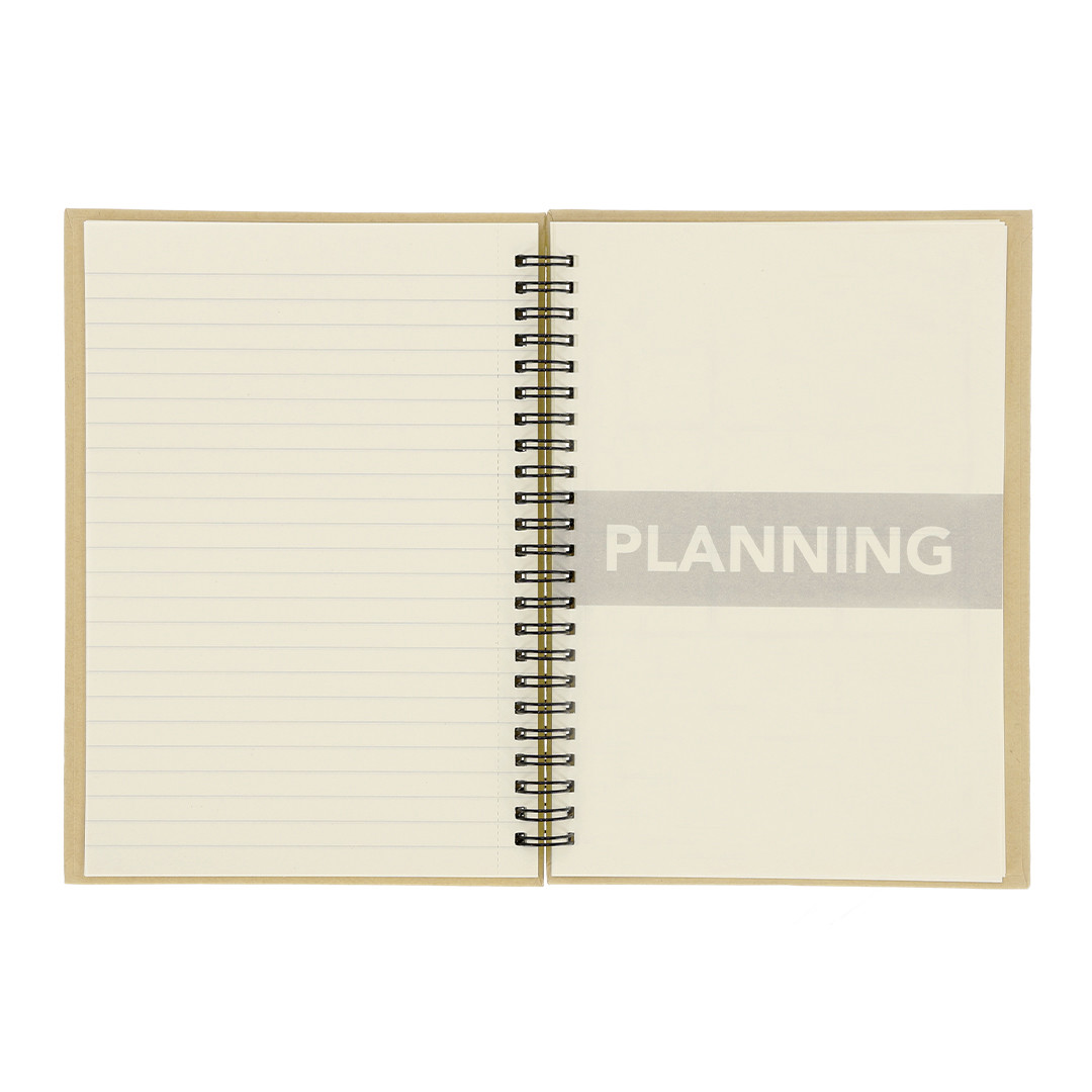 Notebook with monthly planner included, featuring hard covers made of recycled cardboard. Contains 80 cream-coloured sheets with ruled lines and easy-tear marks, 13 undated monthly planner sheets with monthly calendar view, and 2 additional lined sheets for notes. Perfect for planning your month, taking notes and keeping your daily life organised. The recycled cardboard comes from the reuse of production surplus and end-of-life paper, turning it into an eco-friendly and sustainable canvas. Hard Cover. 80 Sheets + 13 Planning Sheets