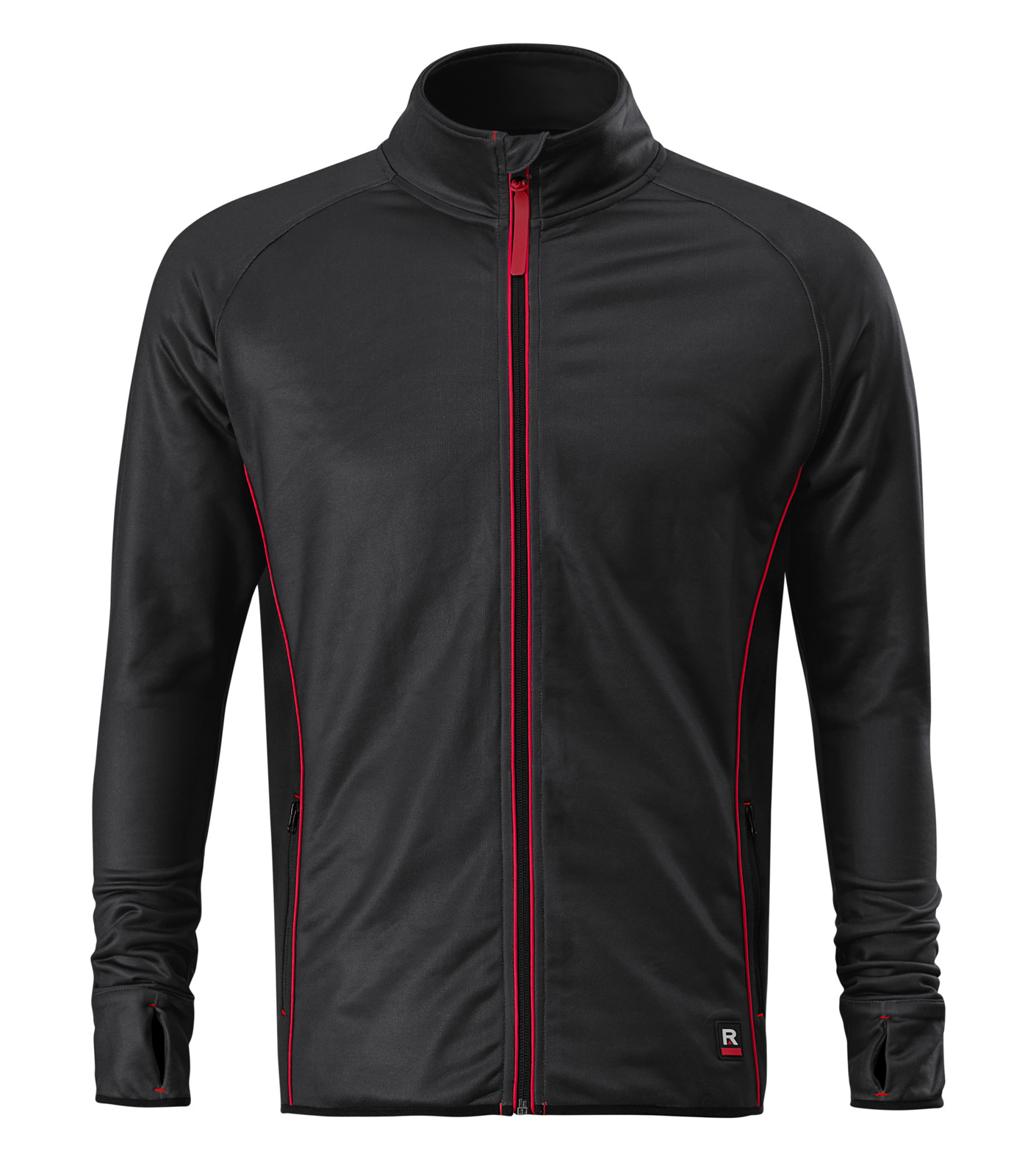 Smooth stretch quick-drying fabric, straight cut with side seams, full-length reverse coil zipper with chin protection, inner neckline with a tape, raglan sleeves, cuffs with hole for thumb, zip pockets, trimmed by elastic stripe, contrast elements, hanging loop