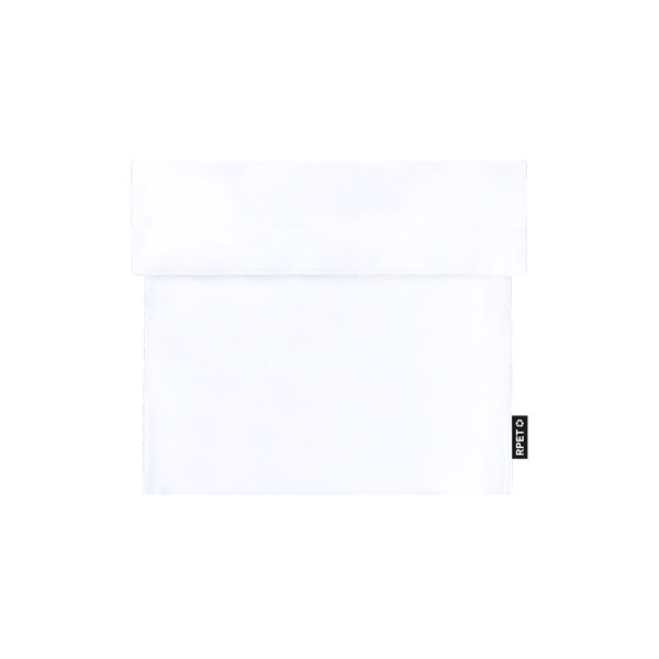 Thermal snack holder made of RPET 210T polyester. Isothermal interior in PEVA, with velcro closure and external label with RPET designation.RPET material is made from recycled plastic to promote the reuse of plastic waste and help the sustainability of the planet.