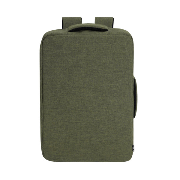 Document holder backpack made from durable RPET 300D. It features an urban design that incorporates a main pocket with a hidden zipper closure for added protection, with dual pullers. Includes a padded interior for laptops up to 15 inches, additional pockets inside for small items. Its shoulder straps and back are padded and adjustable for added comfort. Offers three transport modes: as a backpack, thanks to the padded shoulder straps; as a document holder, thanks to its carrying handle; and a strap for a trolley. The RPET material is made from recycled plastic, promoting the reuse of plastic waste and helping the planet's sustainability. Padded Laptop Compartment. Padded Back and Shoulder Straps