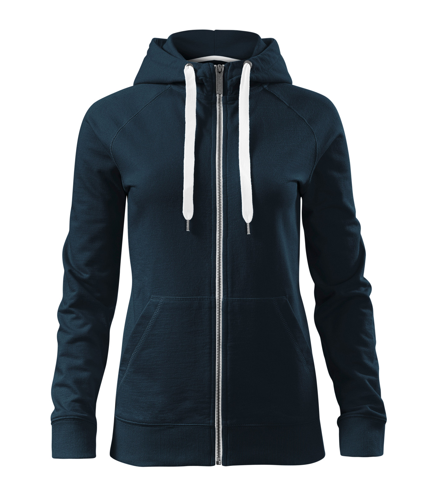 Blago strukiran kroj s bočnim šavovima, metalni patentni zatvarač pune duljine, klizač patentnog zatvarača s ugraviranim logotipom, kapuljača s podstavom i vezicom za stezanje, unutrašnja strana ovratnika sa trakom, raglan rukavi s ukrasnim prošivom, vanjski džepovi u stilu klokana, donji rub i manšete od rebrastog pletiva 2:2 s 5 % elastana, kontrastni elementi, nečupavljena unutarnja strana